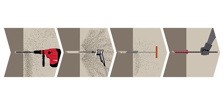 SafeSet is a proven system that automatically cleans the hole as you drill. This more efficient process requires a Hilti hollow drill bit and an appropriately sized Hilti vacuum cleaner.